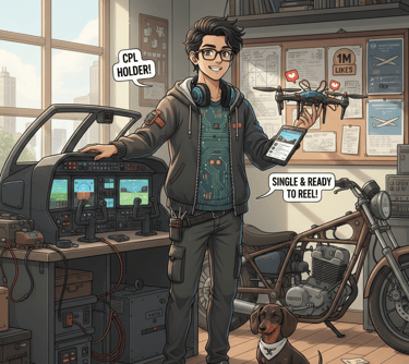 This unassuming Mallu is a multifaceted personality and a quintessential nerd cum techno-geek. Ok, so where to start? Dig this. Guy has designed a Cessna Sim for starters. Turns out in between the breaks he built his very own 'home made' drone too. Flights are limited till its certified. Weekends, he spends stripping down and reassembling motorcycles. With his faithful Daschund 'Brownie' in tow. Yeah, did we mention he reels too. With a 1M likes under his belt, guy's a real prize. R U listening ladies? Last we checked, status was single. Lest we forget to mention, he has a CPL too and has tutored quite a few wannabes on the way, Here's the clincher, !! on weekends, this sleeky dude can steal the show with his guitar too.